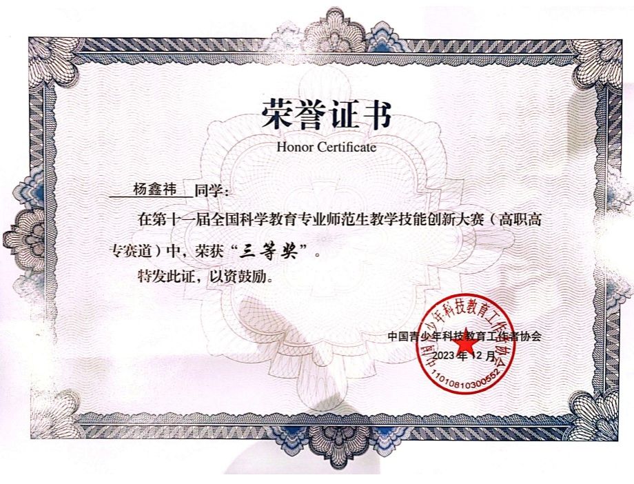 12月12日,以“培养未来卓越科学教师”为主题的“第十一届全国科学教育专业师范生教学技能创新大赛”在上饶幼儿高等师范专科学校落下帷幕。本次大赛由中国青少年科技辅导员协会和上饶幼儿高等师范专科学校联合举办。自初赛开始,全国87所高校的942名选手同台竞技,经过初赛的激烈的角逐,严格的资格审查和初评,共有86所高校的405名选手入围决赛,后又经过决赛的比拼,beat36521级小学科学教育专业学生杨鑫祎在比赛中脱颖而出,荣获该赛项“三等奖”。