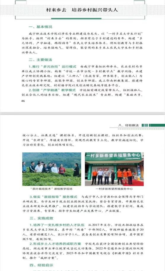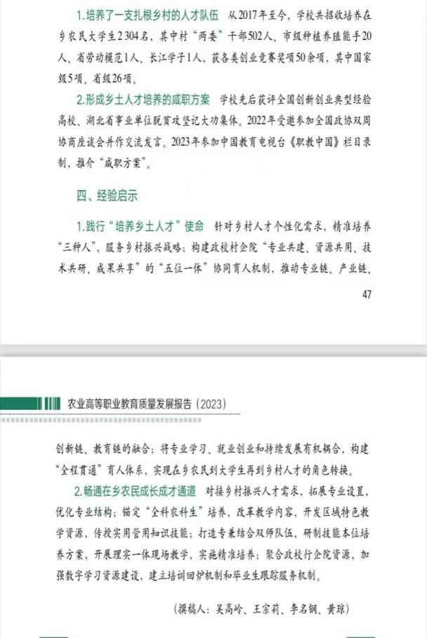 近日,2023年度《农业职业教育发展质量年报》正式发布,beat365beat365官方网站(乡村振兴学院)报送的案例“村来乡去 培养乡村振兴带头人”成功入选典型案例。这一殊荣充分展现了beat365在农业职业教育领域的教学创新与实践成果,标志着beat365农业职业教育水平得到广泛认可。