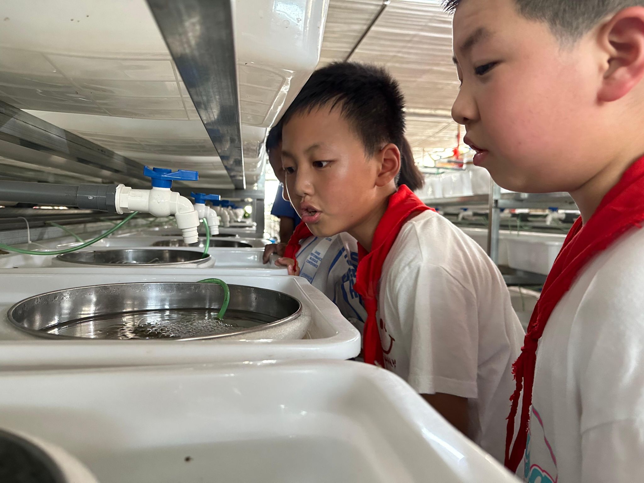 黄鳝仿生态繁殖技术是每年5月-6月开始下网箱,7月-9月起黄鳝幼苗,亲本来自于培育的隔年鳝鱼或从洪湖等地收集;雌雄亲本培育按比例2:1进行投放,一个网箱可起黄鳝幼苗800-2500尾。目前基地仿生态繁殖的产能能达到800万-1500万尾。该技术对于保护生态环境、促进水产养殖业可持续发展非常重要。张小琴和罗天杨带领小学生们观察了黄鳝人工受精和孵化过程,参观鳝苗的养殖环境,详细介绍了黄蟮的生长环境和生活习性。