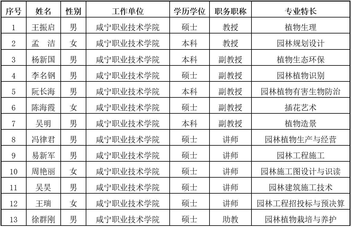 园林技术师资团队共有校内教师13人,其中教授2人,副教授5人,讲师5人,助教1人。团队中1人荣获全国职业技能竞赛优秀指导教师、4人荣获湖北省职业技能竞赛优秀指导教师。校外兼职教师6人,均来自园林行业一线企业。