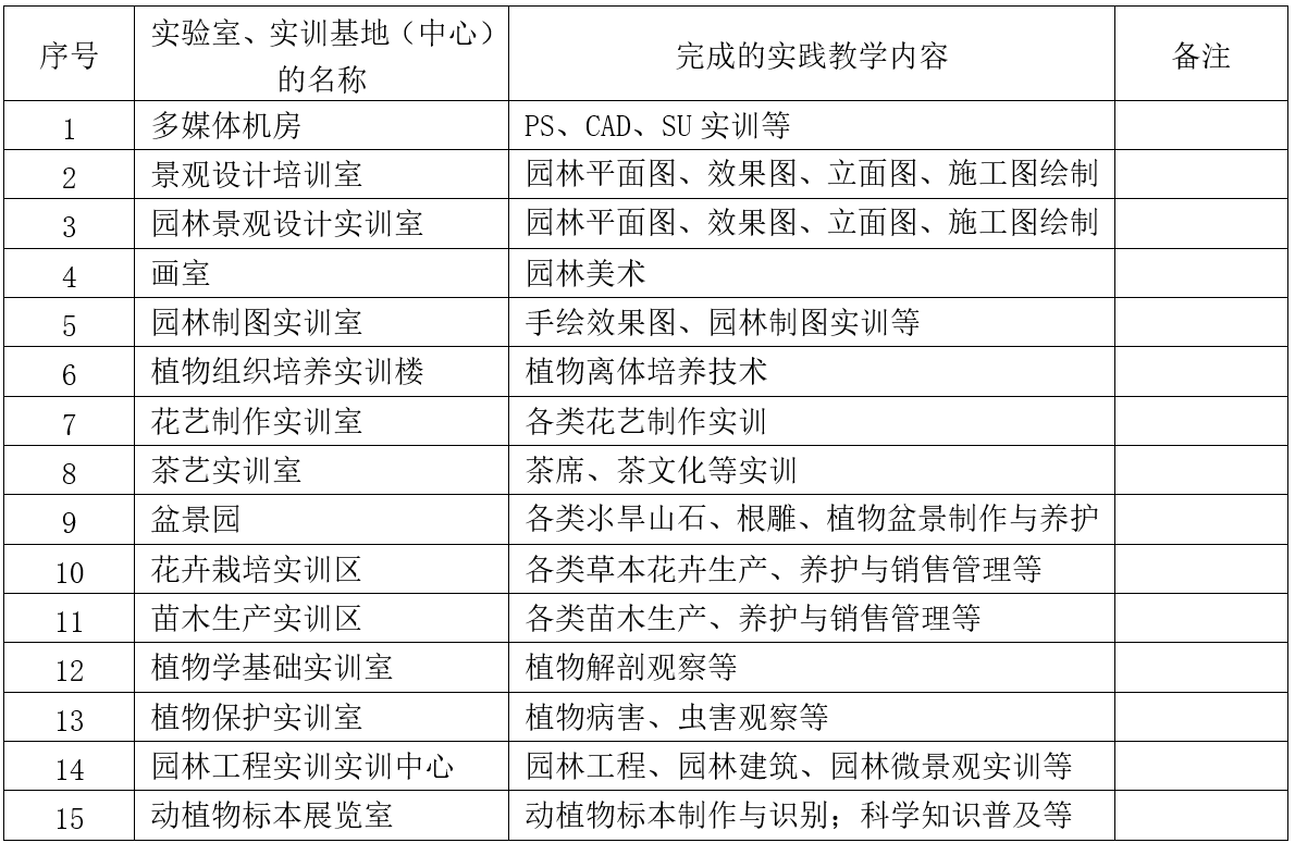 园林技术专业共有校内实训室12个,其中设计制图机房、实训室3个,植物栽培、生产、保护实训区4个,园林工程、测量实训室2个,花艺、组培实训室2个。园林技术专业设有校外实训基地及实训点21个,主要开展课程实训、科普教育、师生顶岗、人员培训、专业综合实训等活动。