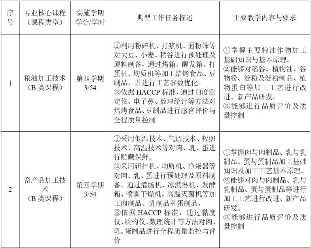 粮油加工技术、畜产品加工技术、果蔬加工技术、农产品储藏与保鲜技术、农产品质量检测技术、农产品质量安全与控制技术等。