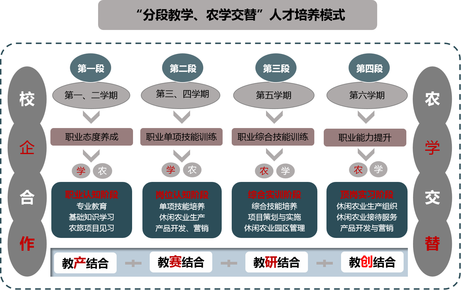 休闲农业经营与管理专业是湖北省现代农业技术专业群骨干专业,咸宁市“乡村振兴战略”人才培养重点专业,校级特色专业。本专业通过校企共建,实施“分段教学、农学交替”的人才培养模式,校企双主体双场景联合培养休闲农业行业高技能人才。