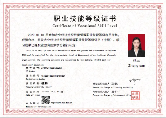 农业经济组织经营管理、家庭农场粮食生产经营等职业技能等级证书。