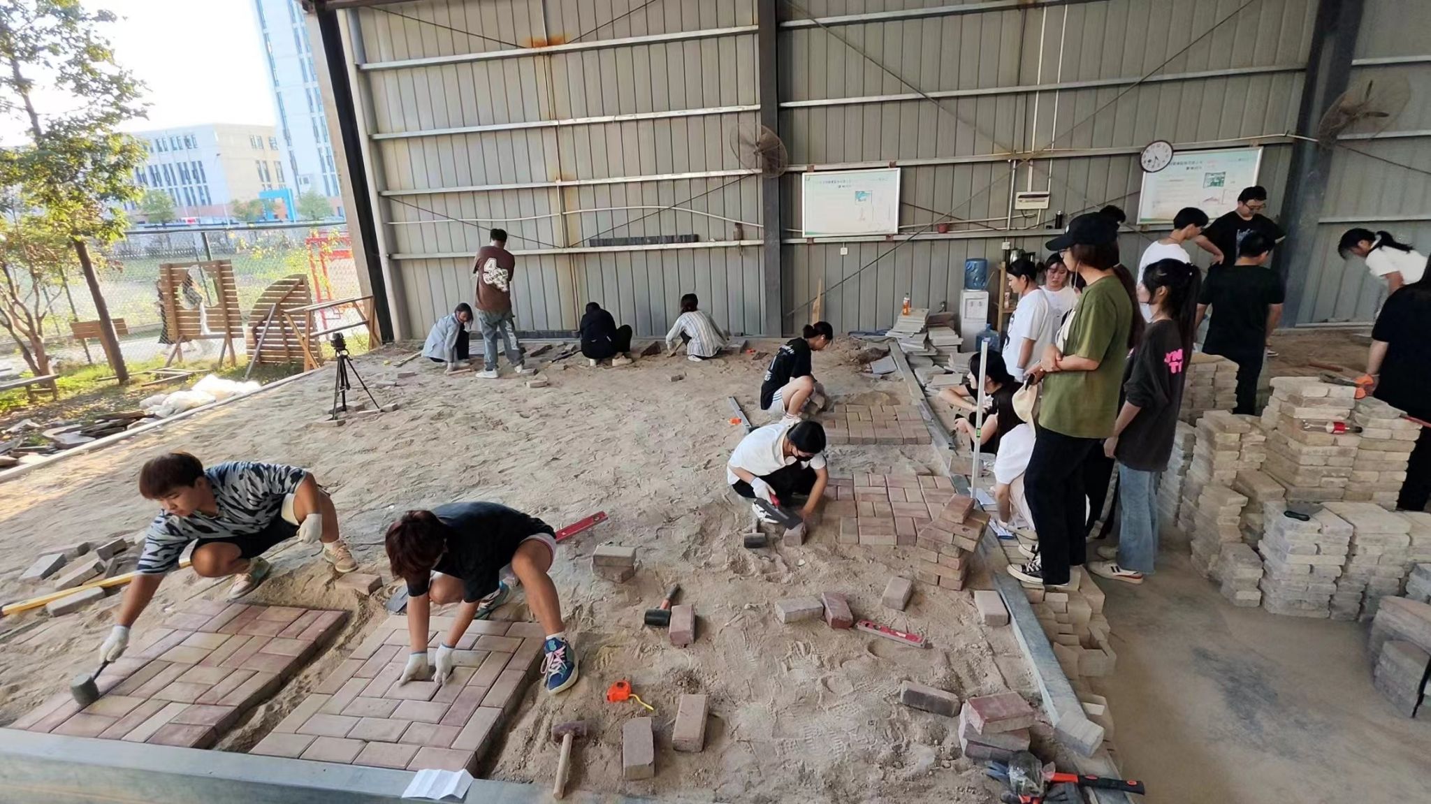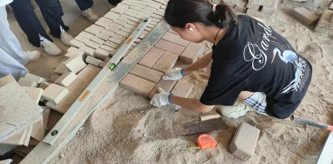 本次“园林施工”技能竞赛内容选取了园林透水砖园路的施工,属于园林施工岗位的真实工作内容,与园林技术专业核心课程《园林工程》紧密相关。赛前经施工培训将学生分为4组,每组9人,要求同学们使用施工工具在30分钟内完成80cm*80cm园林透水砖园路的放线、开挖、夯实、铺装、复核等工作。每个小组完成后,由专业教师带领小组成员测量园路尺寸、标高的施工偏差值。为培养学生精益求精的工匠精神,各项测量值均以mm为单位计算。